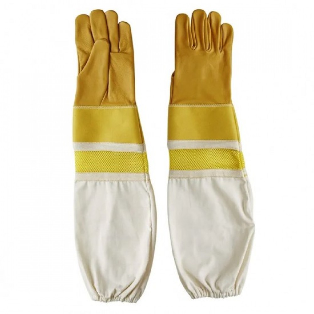 Protective beekeeping gloves with sting-resistant material, reinforced palm, and long cuffs for safe and comfortable hive handling.